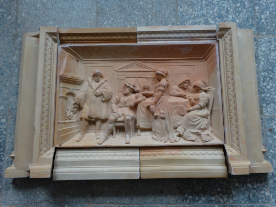 Widzimy na nich jak XVI-wieczny cesarz rzymski Karol V Habsburg przygląda się Antonowi Fuggerowi palącemu w kominku jego papiery dłużne. Wcześniej to właśnie dzięki pieniądzom pożyczonym przez potężną rodzinę bankierów został cesarzem. Odpłacał się licznymi przywilejami, a gdy nie mógł w terminie spłacić części pożyczki, jego wierzyciele wspaniałomyślnie spalili weksle. Powyższa scena przedstawiona jest na środkowym kaflu pieca ze szczecińskiej kamienicy. Ale to tylko jeden z elementów bogatego zdobienia.