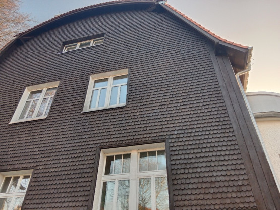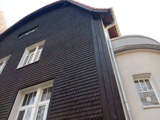 Wczesnomodernistyczny budynek powstał w latach 1907-11, jako część willowej dzielnicy Neu Westend. Najbardziej oryginalnym elementem jego dekoracji jest drewniany gont, pokrywający część elewacji. Interesująca jest też sama bryła budynku, z wysokim, mansardowym dachem. Willa przeszła właśnie renowację.