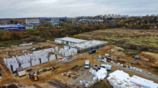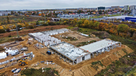 – Najbardziej okazale prezentują się pawilony D i E, w których zakończono już roboty konstrukcyjne, a obecnie trwają prace przy pokryciu dachów – montaż blachy oraz świetlików. Gotowe są już także ściany nośne pawilonów A, B i C, a w dwóch z nich zakończono też roboty związane z wykonaniem stropów i podciągów pawilonów – relacjonuje Paulina Łątka z urzędu miasta.