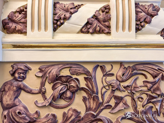 W ramach prac konserwatorskich zrekonstruowano także kasetową dekorację stropu, balustrady i witraże. Trudno jednak rozpoznać, które elementy są oryginalne, a które odtworzone – tylko oko fachowca będzie w stanie dostrzec różnice. Za prace odpowiedzialna jest pracownia Patrik Art z Torunia.