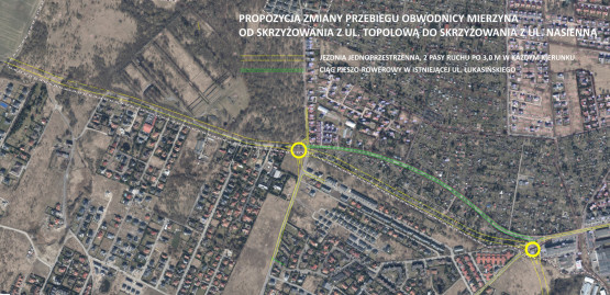 Obwodnica Mierzyna będzie miała ok. 4,8 km długości. Rozpocznie się przy skrzyżowaniu na końcu ul. Ku Słońcu, w pobliżu CH Ster (najprawdopodobniej powstanie tam rondo). Trasa początkowo będzie wiodła na północ (do połączenia ulic Topolowej i Łukasińskiego), a później skręci na zachód (częściowo przez teren ogródków działkowych). Na połączeniu z ul. Nasienną planowane jest rondo.