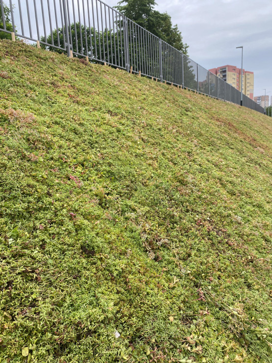Szczecińska firma Green Fingers ułożyła na skarpie przy ul. Szafera matę rozchodnikową pokrywającą łącznie ok. 700 m kw. To pierwsze takie rozwiązanie zastosowane w Szczecinie w ramach miejskiej inwestycji. Mata składa się z różnorodnych gatunków rozchodników, rosnących na specjalnie przygotowanym podkładzie kokosowym. Nie trzeba jej intensywnie podlewać, nie wymaga koszenia, jest odporna na niesprzyjające warunki pogodowe. Od razu zazieleniła skarpę i ma cieszyć oko przez cały rok.