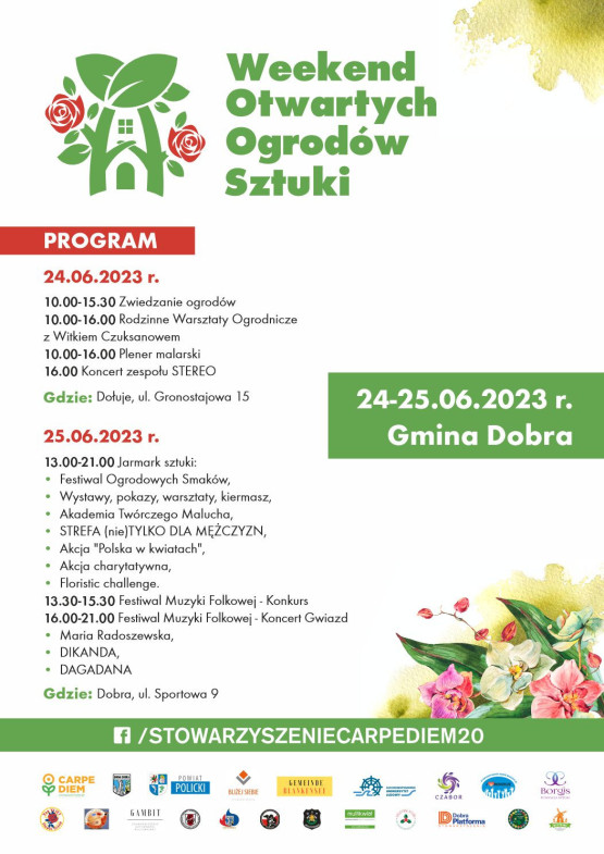 W niedzielę Weekend Otwartych Ogrodów Sztuki przeniesie się na teren sportowo-rekreacyjny przy ulicy Sportowej 9 w Dobrej. W programie m.in. Festiwal Muzyki Folkowej, pokaz florystyczny, licytacje prac kwiatowych artystów – Mai Felińskiej, Łukasza Krytkowskiego, Rafała Staszczyka, Pracowni „Plantacja”. W ramach festiwalu zaplanowano koncerty Marii Radoszewskiej oraz zespołów Dikanda i Dagadana.