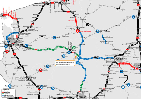 – Stargard – Suchań - dł. 13,8 km, złożono cztery oferty z kwotami od 450,38 do 630,5 mln zł, budżet GDDKiA wynosi 562,6 zł;