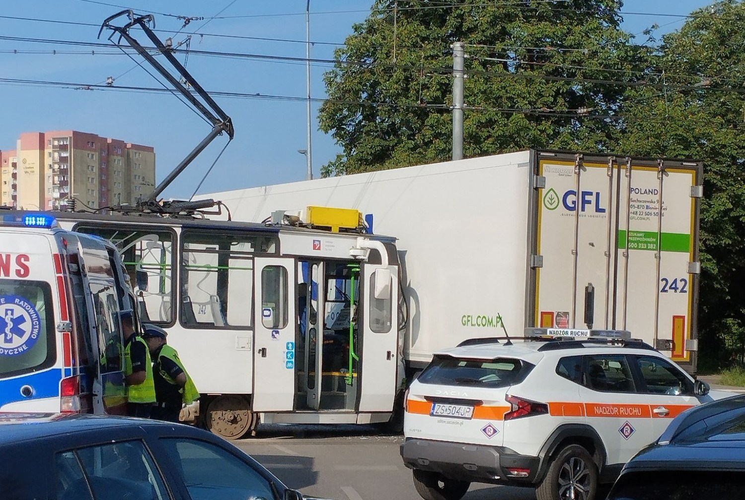 Nie ma osób poszkodowanych, lecz występują poważne utrudnienia w ruchu. Do kolizji doszło na rondzie Olszewskiego w Szczecinie. Tramwaj uderzył w bok ciężarówki. Na miejscu pracuje policja, ustalając okoliczności zdarzenia.