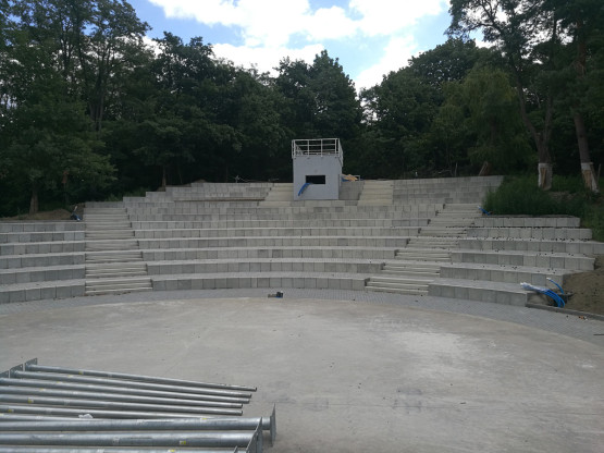 Prace trwają także przy zagospodarowaniu terenu. Niwelowane i kształtowane są skarpy, montowane jest również zewnętrzne oświetlenie, gdyż do amfiteatru doprowadzona została instalacja elektryczna. Przy obiekcie wybudowane zostały miejsca parkingowe. Na sam koniec pojawią się nowe nasadzenia.