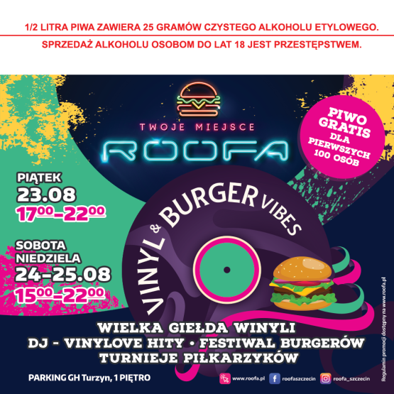 W weekend w Strefie nie zabraknie też muzyki. Od piątku do niedzieli organizatorzy zapraszają na VinyLOVE potańcówki. O oprawę muzyczną zadba Kraff z Downtempo City Funk. Zaserwuje same hity, które z pewnością każdego porwą do tańca. Poza licznymi wystawcami na odwiedzających Roofę będą czekać także piłkarzyki, turnieje i konkursy z gastronomicznymi nagrodami, pyszne jedzenie, zimne napoje. Zaplanowano też festiwal burgerów serwowanych przez Grilled Chicken Burgers. Szykuje się więc totalny chillout! Oczywiście na pierwsze 100 osób, które każdego dnia pojawią się w Strefie Roofa, czekają darmowe piwa.