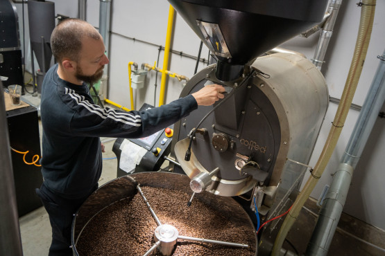 Cały proces przygotowania takiej kawy wygląda następująco. Kluczowa tutaj jest beczka po alkoholu, która musi spełniać pewne wymagania. Wnętrze beczki nie może być wyschnięte, ani zabrudzone. Podczas maceracji, wilgoć wraz z aromatami poprzedniego beczkowanego produktu przechodzą do wybranej, wsypanej do środka kawy. W tym roku wykorzystaliśmy kawę specialty z Brazylii, z obróbki beztlenowej, która sama w sobie ma nuty winne, więc zostały one fajnie podkreślone. Cały proces leżakowania może trwać od tygodnia do dwóch – wszystko zależy od wilgotności drewna i ewentualnej obecności płynu na dnie. Ziarna muszą równomiernie chłonąć nowe aromaty, dlatego codziennie w palarni toczyliśmy beczkę i regularnie sprawdzaliśmy wilgotność zielonej kawy, w celu zatrzymania procesu w odpowiednim momencie. Na samym końcu musieliśmy kawę wysuszyć, żeby uniknąć pleśni, a następnie przygotować profil palenia i wypalić ziarna.