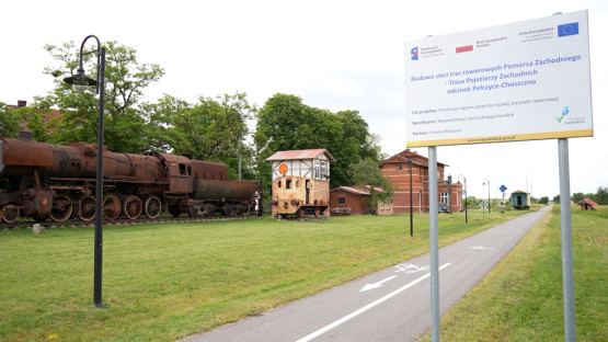 Parowóz i inne historyczne eksponaty tuż przy ścieżce rowerowej