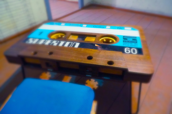Stolik w formie wielkiej kasety z Wiskordu – Podziemne Trasy Szczecina