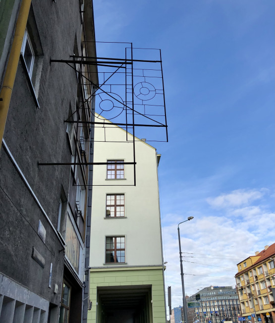 – Kawał zardzewiałego żelastwa. Nikt nie zwraca na niego uwagi. Może to brak uroku, może brak tabliczki objaśniającej. Ja patrzę z czułością, bo to mój dowód rzeczowy na utrapienia i komplikacje związane z organizacją wystawy – opowiada Justyna Machnik, która dużo się natrudziła, by od kierownika budowy na Wyszyńskiego (ocieplano tam ściany) zdobyć demontowaną reklamę.