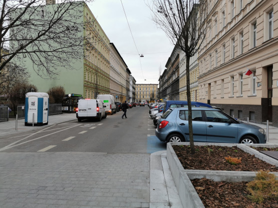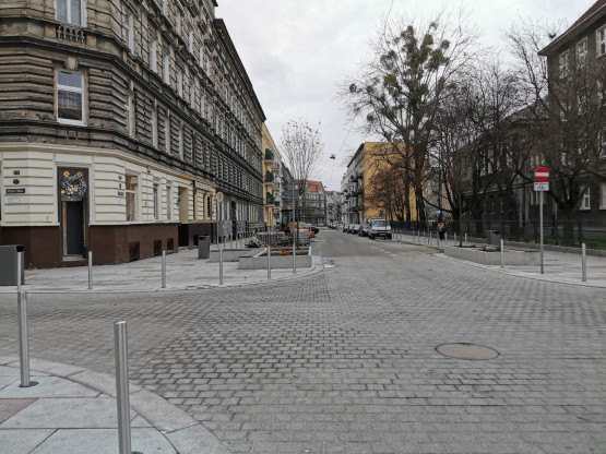 Piesi mają do dyspozycji szersze chodniki, zabezpieczone słupkami, aby nie wjeżdżały na nie samochody. Pojawił się szpaler 26 drzew i elementy małej architektury - betonowe donice z siedziskiem z kompozytu drewnianego, zagospodarowane zielenią.