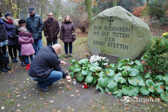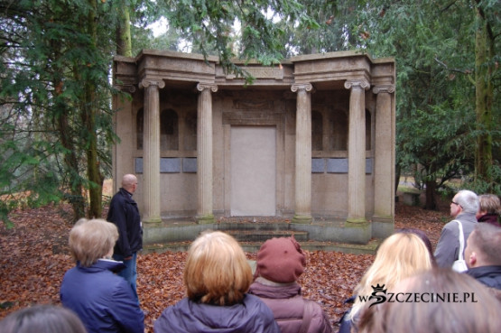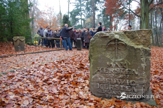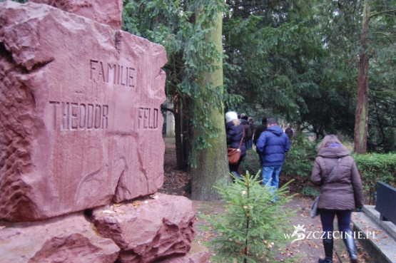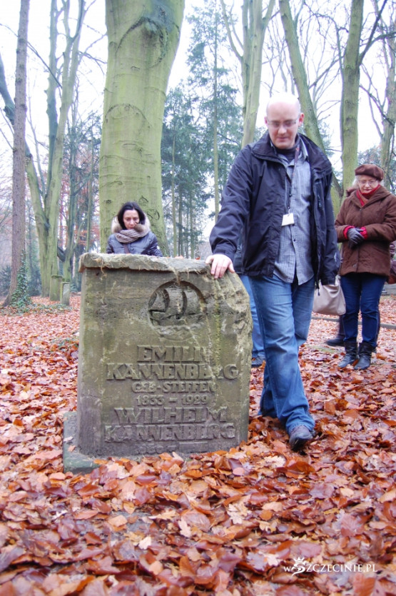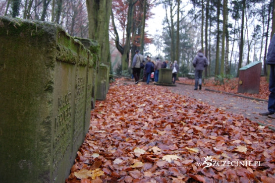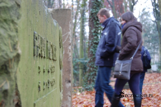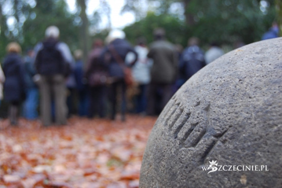 Tutaj stoi pomnik Hermanna, ale szczeciński burmistrz – dobrze znany stałym uczestnikom wycieczek – wcale nie spoczywa w tym miejscu. Gdzie? Dlaczego tam? O tym można było dowiedzieć się w trakcie spaceru. Tam nagrobek Wilhelma Meyera-Schwartaua. Była chwila, by przejść aleję zasłużonych, by złożyć znicze w miejscu, które wydawało nam się do tego najodpowiedniejsze. Było kilka słów o układzie Cmentarza Centralnego, o roślinności, którą tam spotkamy – szczególną uwagą został obdarzony miłorząb, którego liście uczestnicy ukradkiem chowali do kieszeni.