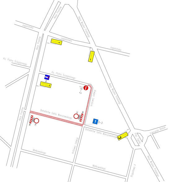 W związku z prowadzonymi pracami w kierunku ul. Piotra Ściegiennego wprowadzony został ruch jednokierunkowy. Natomiast sama ul. Ściegiennego od strony al. Piastów stała się ulicą ślepą i nie ma już wjazdu w ul. Królowej Jadwigi.