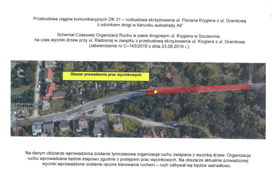 W pasie drogowym ul. Radosnej wycinane będą drzewa. Dlatego w miejscu prowadzenia prac ruch będzie odbywał się wahadłowo. Zmiany będą wprowadzane etapowo, wraz z postępem prac.