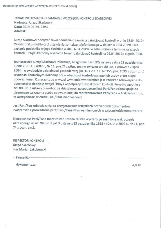 Fałszywe maile przyszły ze skrzynek pocztowych nie pochodzących z domeny Krajowej Administracji Skarbowej - @mf.gov.pl, lecz z domeny @o2.pl i opatrzone zostały podpisem Inspektor Kontroli, Urząd Skarbowy, mgr Marian Jakubowski, który nie jest pracownikiem zachodniopomorskiej KAS. W mailu nie ma również wskazanego konkretnego urzędu skarbowego, tylko ogólna nazwa „urząd skarbowy”.