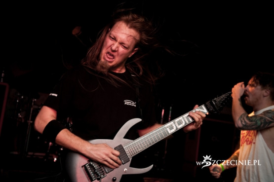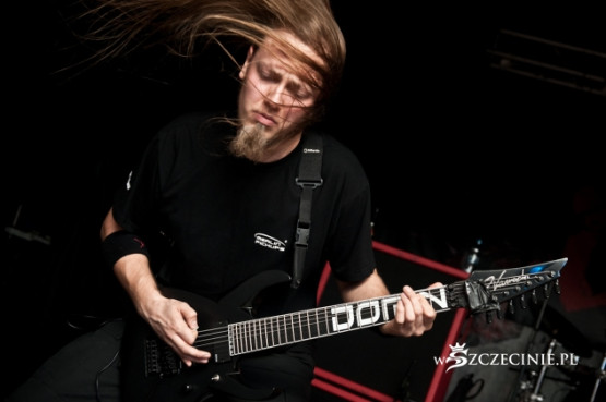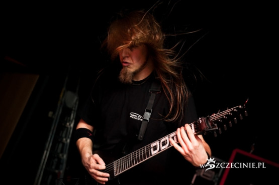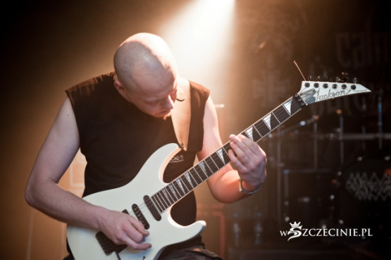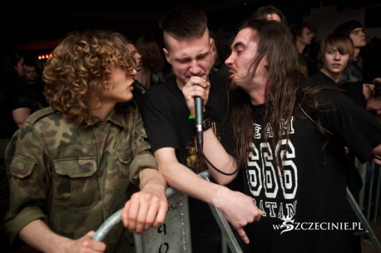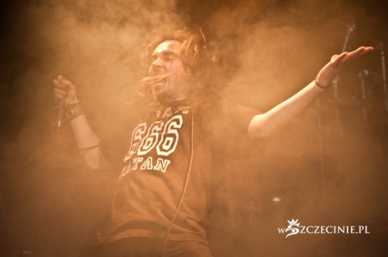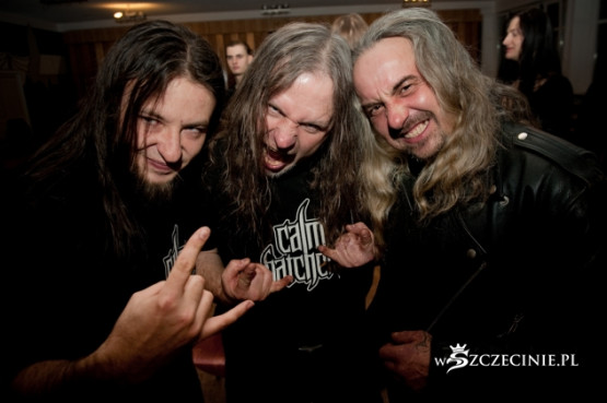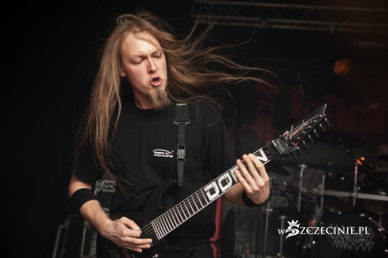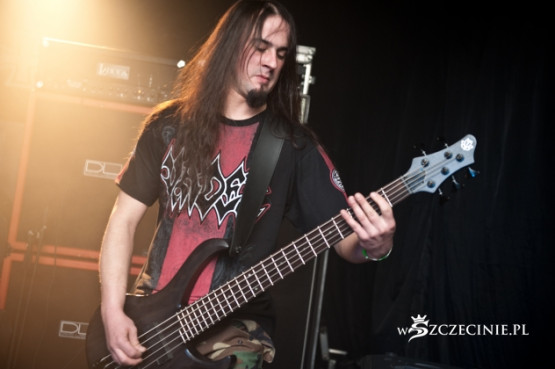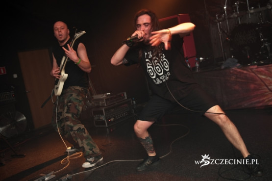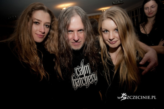 Następny w kolejności - Calm Hatchery, to zespół już w Szczecinie, bardziej znany. Grali u nas m.in. w „Rocker Clubie”, tak więc miejscowa publika wiedziała czego się może spodziewać po tej formacji. Skaczący po scenie Szczepan (wokal) oraz czterej pozostali muzycy zaaplikowali nam mocną dawkę death-thrashowej strawy. Karkołomne zmiany tempa, połamane rytmy i wyrafinowane riffy to składniki tego przekazu. Nie muszę więc chyba dodawać, że publika przyjęła 40 minutowy set tej słupskiej grupy z aprobatą, szybko uruchamiając „młyn” pod sceną. W repertuarze Calm przeważały utwory z płyty „Sacrilege of Humanity”, zatem zagrali m.in. „Messerschmitt”, “We Are The Universe” czy “Shine For The Chosen One”, ale znaleźli też czas na wspominki czyli numer z albumu “El Alamein”, dedykowany załodze najwierniejszych fanów.