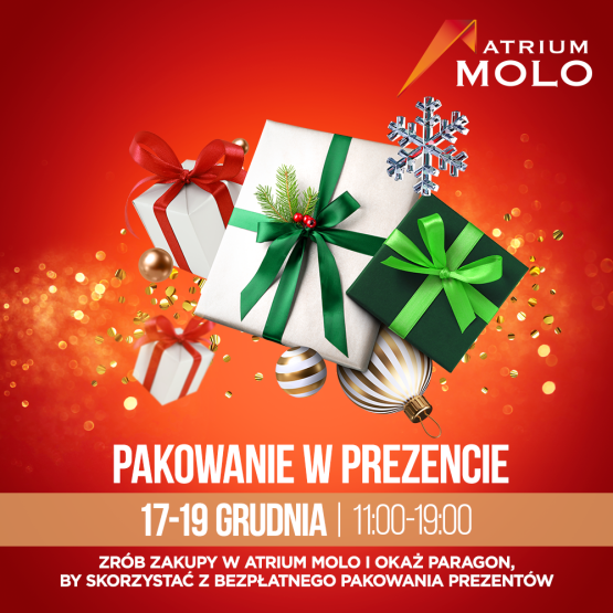 Zakup prezentu to nie wszystko, ważna jest również niebanalna, oryginalna forma zapakowania, która podkreśli wyjątkowość okazji i sprawi dodatkową radość obdarowanemu. Realizację tego zadania kupujący mogą powierzyć Atrium Molo, które zaprasza do bezpłatnej strefy pakowania prezentów w pobliżu sklepu TK Maxx, dostępnej w dniach 17-19 grudnia, w godzinach 11.00 - 19.00. Z usługi mogą skorzystać klienci, którzy zgłoszą się do punktu z paragonem za zakupy zrealizowane w sklepach galerii w okresie 13-19 grudnia.