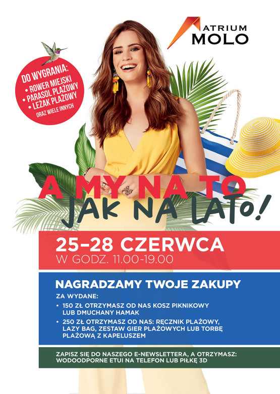 Atrium Molo pomaga przygotować się do plażowania — tak w kilku słowach można określić sedno akcji promocyjnej. Dlaczego? Wystarczy spojrzeć na nagrody: przy paragonie od 150 zł jest to kosz piknikowy lub nadmuchiwany hamak. Za paragon z kwotą zakupu od 250 zł wybór jest jeszcze większy, decydować można pomiędzy: torbą plażową z kapeluszem, dmuchaną sofą lazy bag, zabawkami plażowymi lub okrągłym ręcznikiem. Organizator zastrzega, że ilość nagród jest ograniczona, dlatego do Atrium Molo warto zajrzeć już w najbliższy czwartek.
