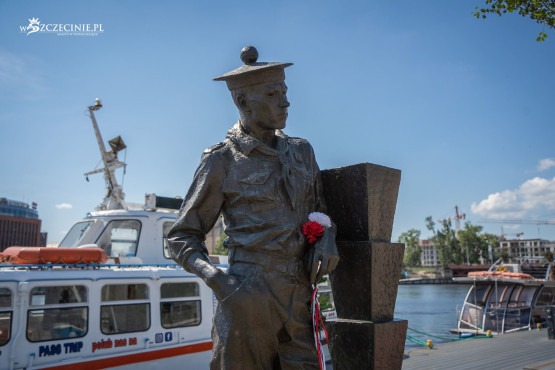 Figuratywnie stanęli tu pionier szczecińskiego żeglarstwa Kazimierz Haska, który przybrał postać z młodości, kiedy był morskim skautem w czapce z pomponem i totemem drużyny.