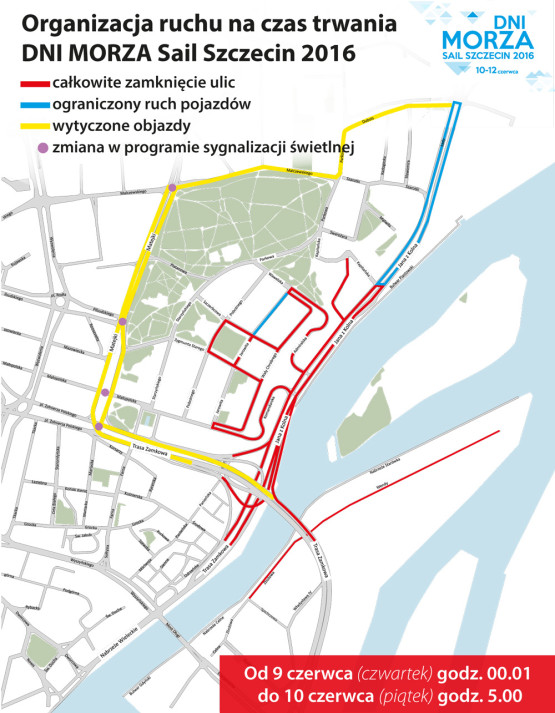 Duże imprezy zawsze wiążą się ze zmianami w organizacji ruchu i komunikacji miejskiej. Pierwsze zamknięcia ulic zaplanowano w nocy ze środy na czwartek. 9 czerwca minutę po północy zamknięte zostaną ulice: Zbożowa (na odcinku od ul. Spichrzowej), Jana z Kolna (na odcinku od ulicy Kapitańskiej do Trasy Zamkowej, ruch zostanie ograniczony na odcinku od Dubois do Kapitańskiej), zjazd z Trasy Zamkowej, Jana z Kolna (na odcinku od Mostu Długiego do ul. Kapitańskiej, z możliwością wjazdu w kierunku pl. Żołnierza Polskiego), Admiralska, Komandorska, Wawelska (od Jarowita), Storrady (od Kapitańskiej, dojazd tylko do posesji), Wały Chrobrego, Szczerbcowa (na odcinku od Wałów Chrobrego do Henryka Pobożnego), Zygmunta Starego (na odcinku od Wałów Chrobrego do Henryka Pobożnego), Małopolska (na odcinku od Jarowita), Jarowita (na odcinku od Zygmunta Starego do Szczerbcowej), Henryka Pobożnego (na odcinku od Zygmunta Starego do Szczerbcowej), Zygmunta Starego (na odcinku od Hołdu Pruskiego do Starzyńskiego będą miejsca postojowe dla TAXI). W piątek, 10 czerwca, od godz. 05:00 zostanie zamknięta też ul. Celna.