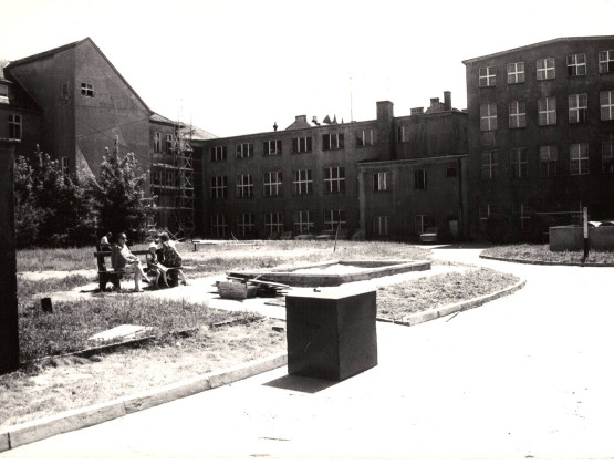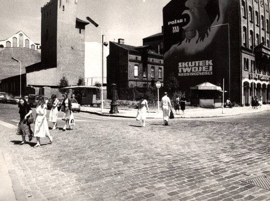 Budynek straży pożarnej z edukacyjnym przesłaniem na ścianie. W latach 90. zasłonił je narożny budynek mieszkaniowy („Zamek”), który wypełnił „dziurę” na rogu ul. Grodzkiej i Tkackiej: