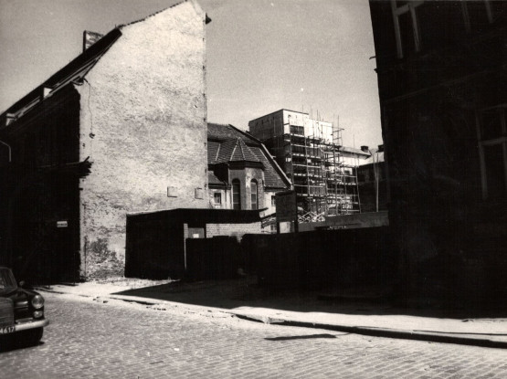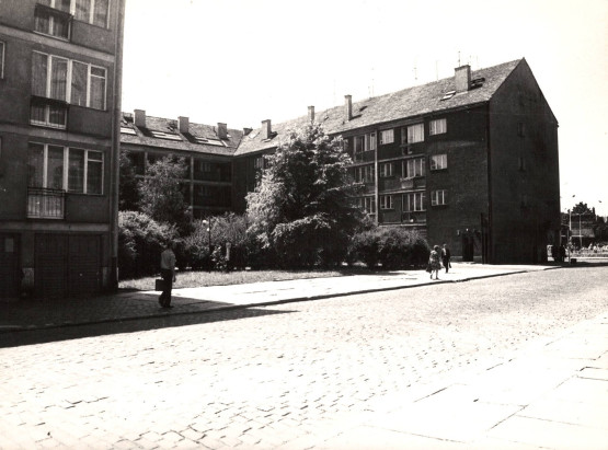 Plac Orła Białego, po prawej ul. Koński Kierat. Pod koniec lat 80. widoczną na zdjęciu oficynę zasłonił budynek mieszkalno-usługowy, który powstał na rogu ul. Staromłyńskiej i Koński Kierat: