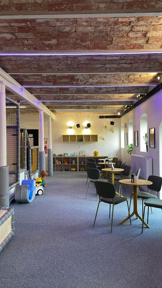Rodzice mogą spędzać czas z dziećmi w sali zabaw lub zostać w kawiarni, gdzie mają podgląd na to, jak dzieci spędzają czas w pomieszczeniu obok.