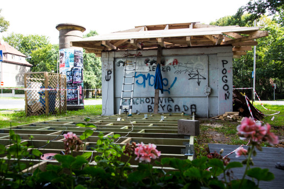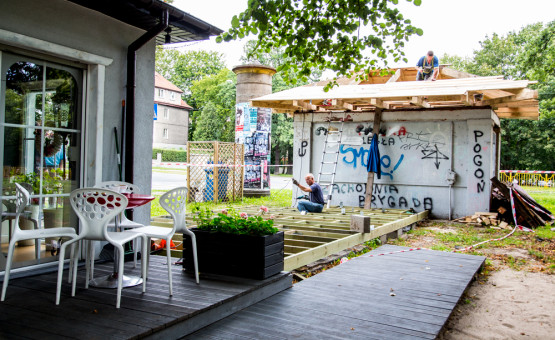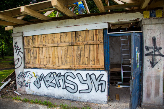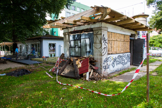 - Dach był w takim stanie, że zagrażał nawet bawiącym się tutaj dzieciom. Do jego demontażu nie trzeba było używać narzędzi. Złożył się od razu – opowiada Dariusz Przybylski, któremu po wielomiesięcznych staraniach udało się wydzierżawić ten zapuszczony obiekt od miasta. Przedwojenną wiatę chce zaadaptować na potrzeby usytuowanej obok kawiarni Biancafe. Co dokładnie powstanie w odnowionym wnętrzu, czy będzie to sala kawiarniana, czy zaplecze kuchenne, jeszcze nie wiadomo.