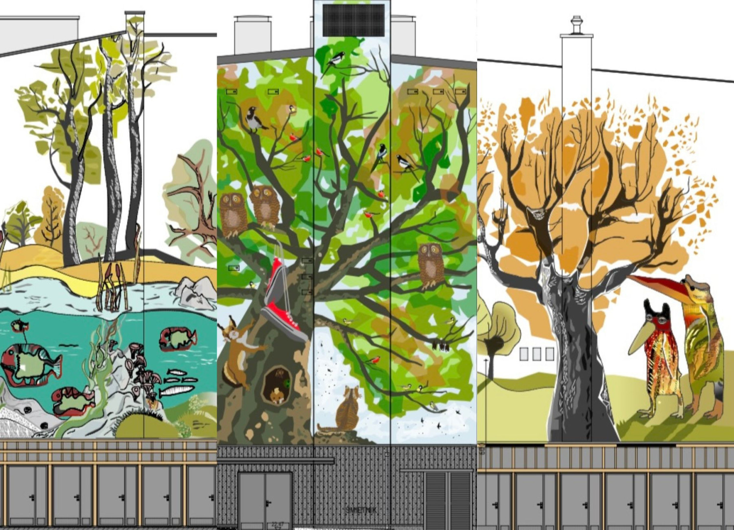 Trzy murale sprawią, że drzewa pojawią się również na „ślepych” ścianach okolicznych oficyn. Na wizualizacjach widać jak kolorowe będą to kompozycje. Ozdobią kamienice przy ul. Boh. Getta Warszawskiego 6, Małkowskiego 7 oraz Boh. Getta Warszawskiego 1 i 2. Chętnych do ich wykonania poznamy najwcześniej 30 lipca.