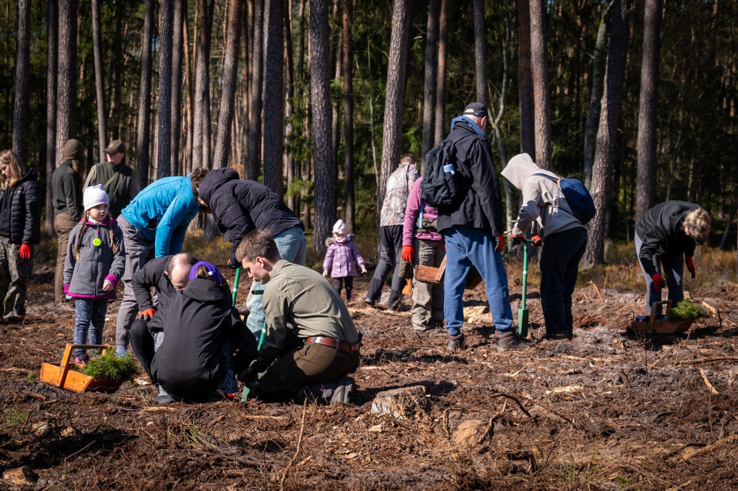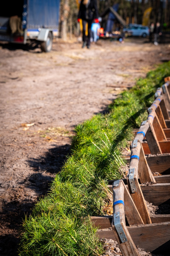 Na początek: instruktaż od leśników. Szybkie tłumaczenie, dlaczego dla miejscowej gleby najlepsze będą sadzonki sosny i wyjaśnienie, jak używać kosztura. Specjalne narzędzie służyło uczestnikom do właściwego wykopania dołka na sadzonki. Po energicznym wbiciu kosztura w glebę należy wykonać kilka ruchów, by poszerzyć dołek, a następnie umiejętnie umieścić w nim sadzonkę – tak aby mogła czerpać składniki odżywcze z ziemi.