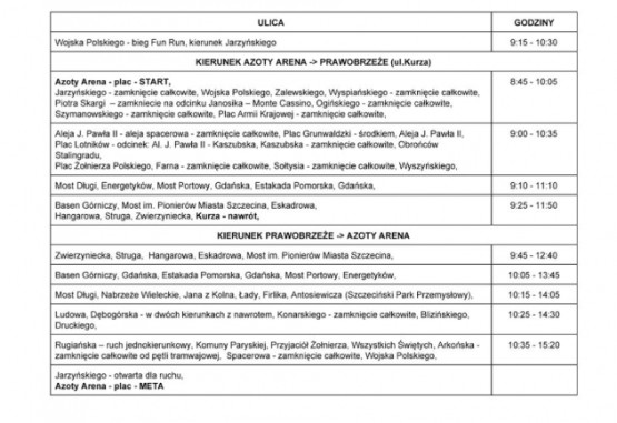 Ulice, przez które prowadzi trasa maratonu, będą zamykane czasowo. Tam, gdzie to możliwe, jak np. na ul. Gdańskiej czy Struga, dla maratończyków zostanie wyznaczony jeden pas jezdni. Szczegóły dotyczące godzin, w których należy się spodziewać utrudnień i w których część ulic będzie zamknięta znajdują się w tabelce poniżej: