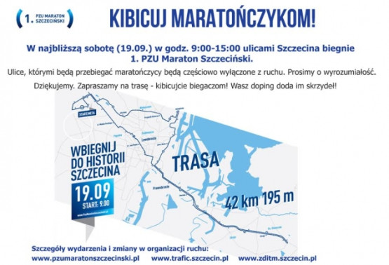 W sobotę, 19 września, o godz. 09:00 wystartuje w 1 PZU Maraton Szczeciński. Licząca ponad 40 kilometrów trasa biegu, będzie prowadziła ulicami zarówno lewobrzeżnego, jak i prawobrzeżnego Szczecina. Przygotowania do maratonu rozpoczęły się już w czwartek wieczorem. Jeden pas ruchu wyłączony został na ulicach: Gdańskiej, Estakadzie Pomorskiej, moście im. Pionierów Miasta Szczecina, Eskadrowej, Hangarowej, Struga, Zwierzynieckiej, Jana z Kolna od Dworca Morskiego w kierunku Łady, Łady, Arkońskiej.