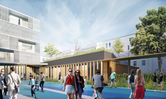 Żłobek w śródmiejskiej przestrzeni z placem zabaw na dachu