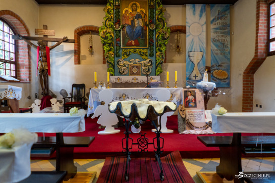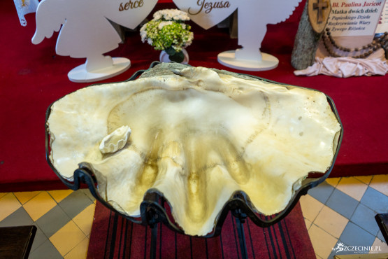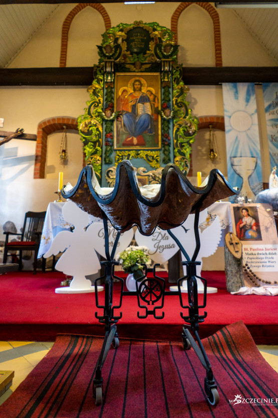 – Bardzo długo szukał, aż w końcu w 2000 roku trafił do sprzedawcy z okolic Dziwnowa. Udało się od niego nabyć muszlę największego perłopława na świecie. Jako misa chrzcielna, osadzona została na stelażu zaprojektowanym przez architekta Juliusza Prandeckiego. Metaloplastykę wykonali szczecińscy stoczniowcy, wykorzystując elementy starych świeczników – opowiada ks. Artur Rasmus, obecny proboszcz parafii pw. Chrystusa Króla.