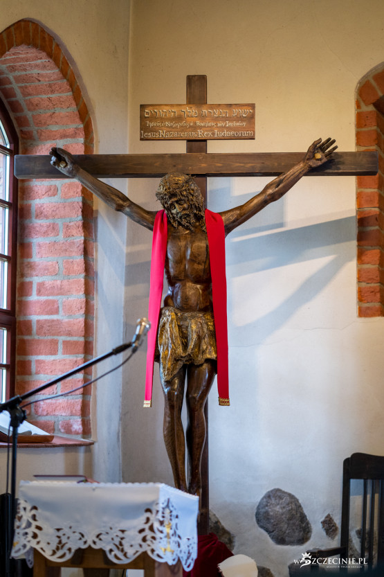 Parafianie przyzwyczaili się już do nietypowej chrzcielnicy, z ciekawością oglądają ją natomiast wszyscy, którzy pierwszy raz zawitają do kościoła w Skolwinie. Intrygujących detali jest tam zresztą więcej. Poczynając od mniejszych muszli przy wejściu, pełniących rolę kropielnic, po doświadczony przez los krucyfiks przy ołtarzu.