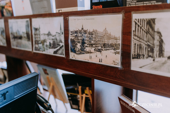 Nad półkami wiszą ryciny. Jest też powiększona pocztówka z około 1910 roku, przedstawiająca ten rejon ulicy, gdzie jesteśmy. Wzdłuż ulicy rosną na niej jeszcze lipy, które niedawno zostały wyrżnięte pod projektowaną ścieżkę rowerową.