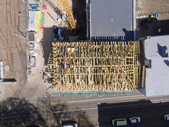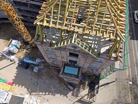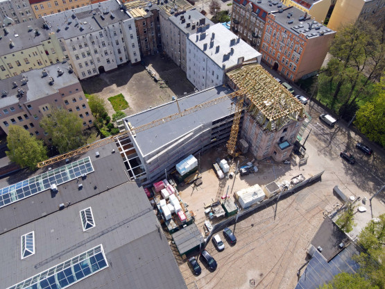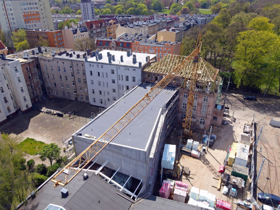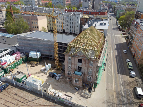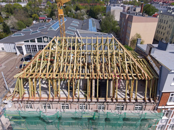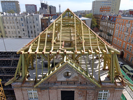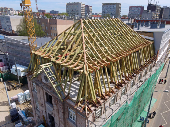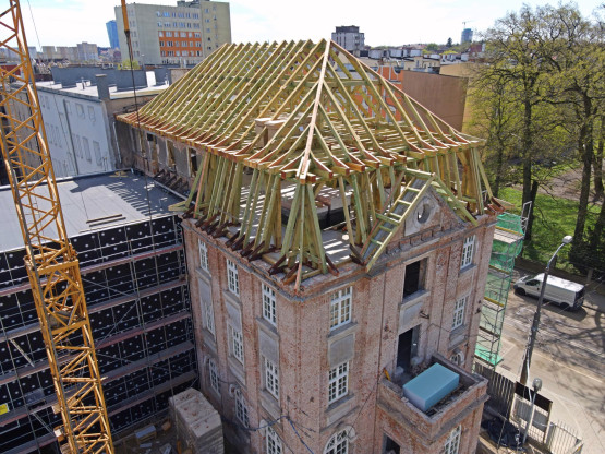 Konstrukcja więźby dachowej jest już niemal gotowa, wkrótce rozpocznie się montaż poszycia dachu. Niżej pojawiają się nowe okna, będą miały zachowany historyczny wzór. Prowadzone są też prace wykończeniowe i instalacyjne.