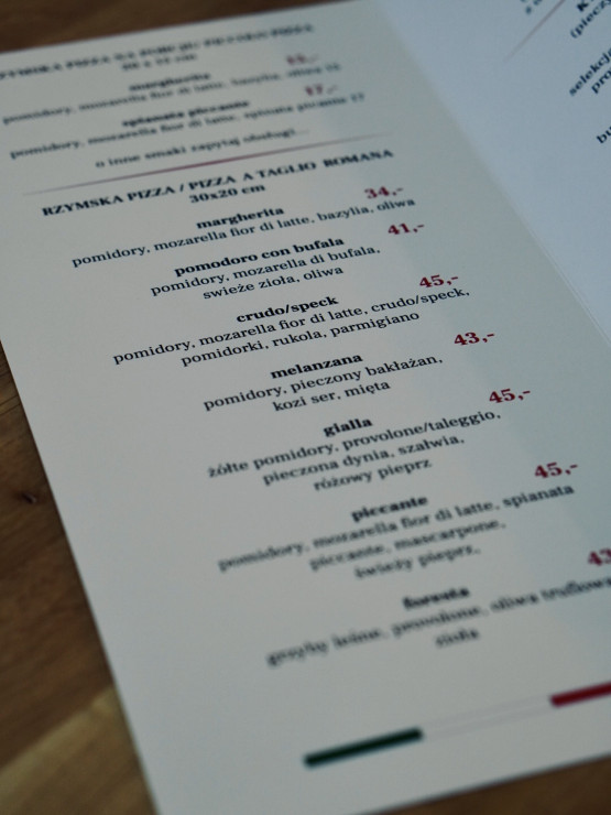Na kawałki codziennie dostępne mają być margherita oraz pizza spianata piccante. Pozostałe rodzaje będą się zmieniać każdego dnia. Poza tym w karcie znajdziemy między innymi pizzę pomodoro con bufala, gialle z szafranem i żółtymi pomidorami, melazanę z kozim serem czy crudo z oryginalną włoską szynką i rukolą.