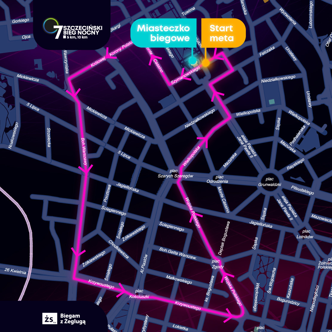 Start i meta pozostają na Jasnych Błoniach. Biegacze z ul. Szymanowskiego wbiegną w ul. Monte Cassino, a dalej skręcą w ul. Królowej Korony Polskiej i Al. Bohaterów Warszawy, by dotrzeć na Turzyn.