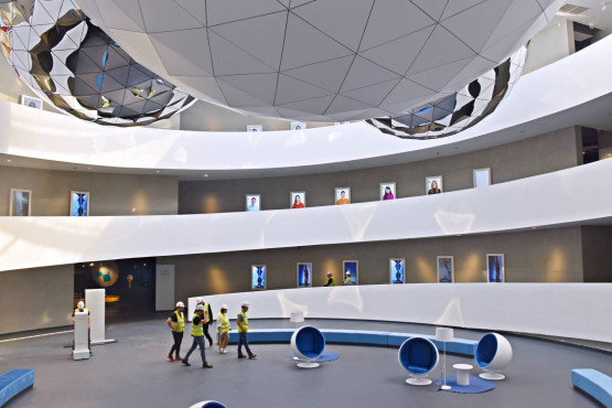 Centralną częścią Centrum Edukacyjnego jest atrium – przestrzeń wypoczynkowa, w której będą organizowane pokazy naukowe i inne wydarzenia. Wszystko pod olbrzymim modelem cząsteczki wody, zawieszonym nad sufitem. W jednej z kul zaprojektowano salę audytoryjną dla 49 osób.