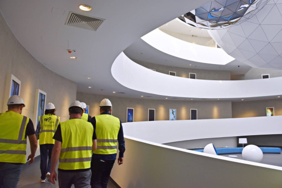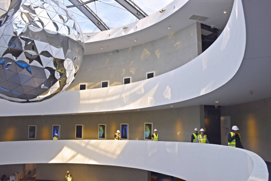 Atrium z wielką cząsteczką wody i spiralny „wir wiedzy”