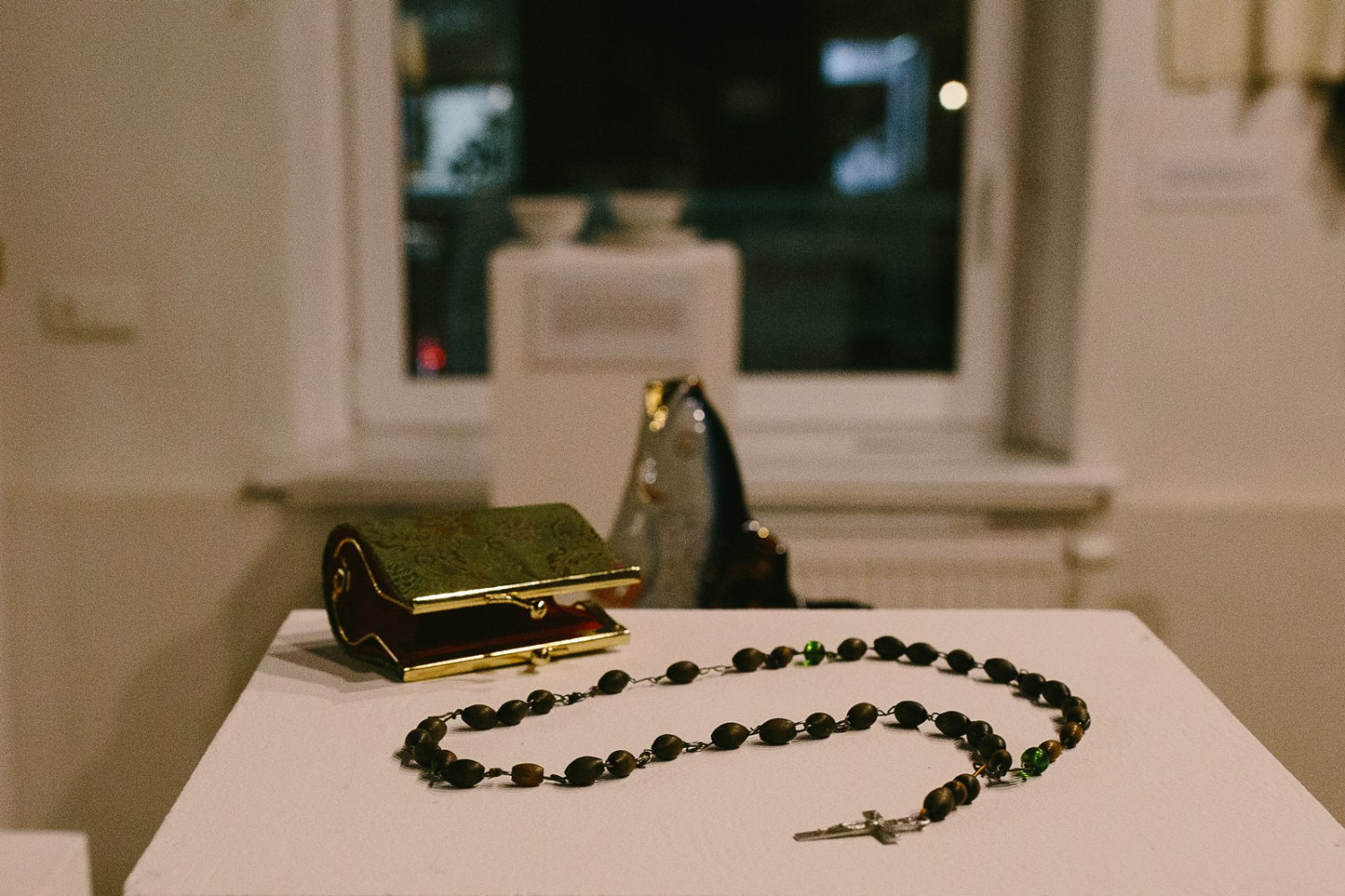 “Ruskie zabierali różaniec, rwali, rzucali. Później mamusia zbierała, my też pomagaliśmy.” – to fragment opisu jednego z przedmiotów, który można zobaczyć w ramach wystawy “Pomniki pamięci” w lokalu na ul. Bałuki 17. Różaniec jest na niej w całości wraz z małym etui.