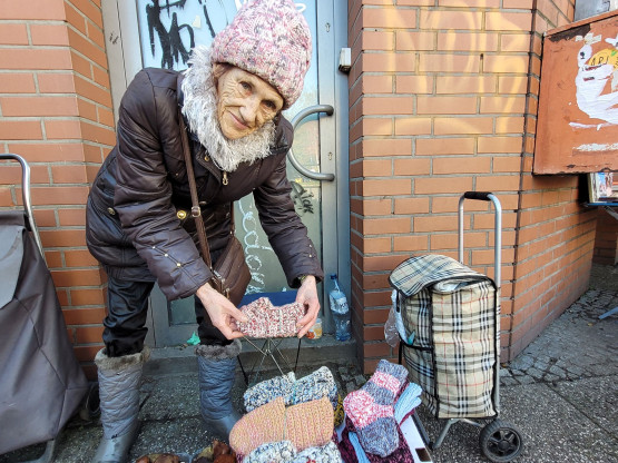 Dlaczego robi czapki na drutach i sprzedaje je w mieście? – Bieda mnie zmusiła – mówi szczerze. – Jak miałam depresję, to siedziałam w domu i dziergałam czapki. Zrobiłam ich mnóstwo i teraz sprzedaję. Ciepłe, grube, dobrze zrobione. Ja od małego dziergam i nauczyłam się szyć już dawno. Zbieram na aparat słuchowy, żeby mi nie szumiało w uchu. Nawet telewizji nie słyszę – mówi nam i dodaje: – Miło mi, że powiedzieli o mnie w radiu i zrobili mnie zdjęcie do Internetu. Nie ma mi kto pomagać w życiu. Córka zmarła, syn ma kłopoty. Ludzie mnie tu szanują, dają mi tu jałmużnę czasami.