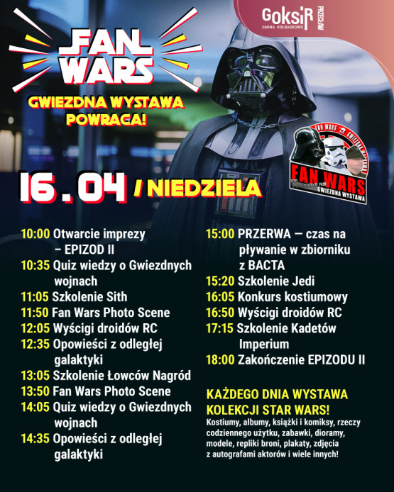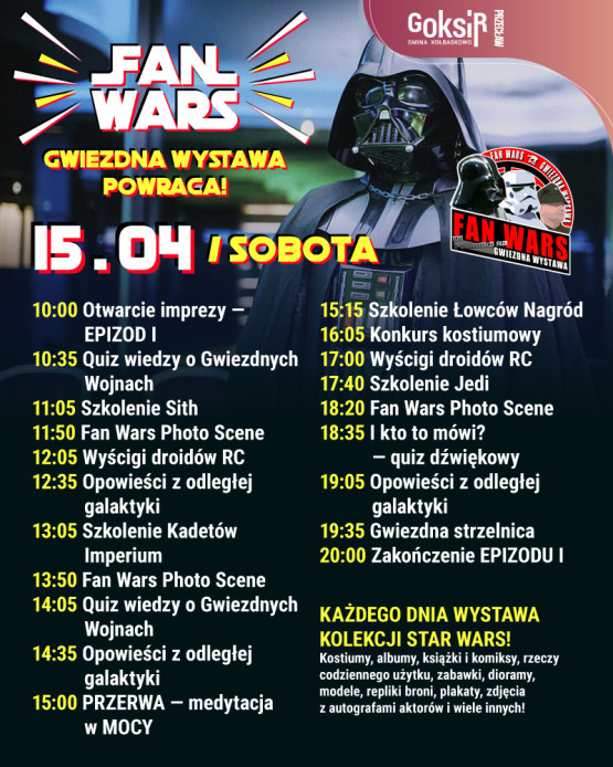 – W sali GOKSiR-u w Przecławiu zaprezentujemy wszystkie nasze najciekawsze zbiory. Główną część wystawy zajmie Lord Vader. Pokażemy całe jego życie i twórczość – śmieje się Tomasz Kęsy z Fan Wars. – Będą przedmioty prezentujące tę ikoniczną postać w różnych wymiarach. Nie zabraknie też Lorda Vadera we własnej osobie. Będzie można zrobić sobie z nim zdjęcie, powalczyć na miecze świetlne czy po prostu zbić piątkę.