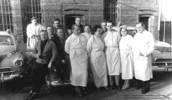 na zdjęciu: Sanitariusze pogotowia i kierowcy Wojewódzkiej Kolumny Transportu Sanitarnego; zdjęcie zostało wykonane w Szczecinie przy al. Wojska Polskiego na przełomie lat 50. i 60. XX wieku.