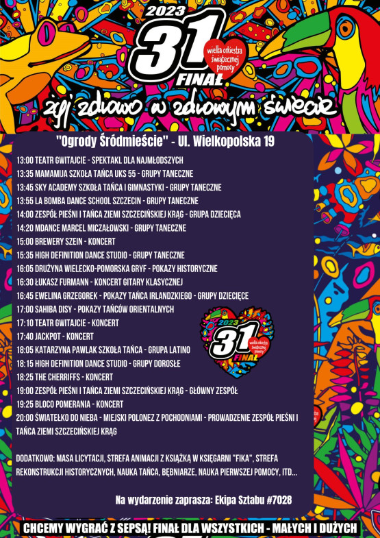 W tym roku miejski finał WOŚP odbędzie się w Ogrodach Śródmieście przy ul. Wielkopolskiej 19. Wydarzenie rozpocznie się o godz. 13:00 i potrwa do godz. 20:00. W tym czasie zaplanowano m.in.: spektakle dla najmłodszych, pokazy taneczne, obóz słowiański przygotowany przez Drużynę Wielecko-Pomorską „Gryf”, strefę zabaw i animacji, naukę pierwszej pomocy, licytacje. Od godz. 15:00 na scenie odbywać się też będą koncerty. Zagrają m.in. zespoły Brewery Szein, The Cheeriffs, Bloco Pomerania, duet Jackpot, Łukasz Furmann na gitarze klasycznej.