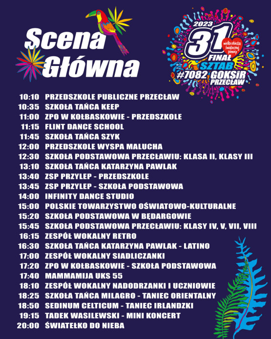 Bardzo dużo atrakcji w niedzielę zaplanowano również w Gminnym Ośrodku Kultury Sportu i Rekreacji w Przecławiu. Od godz. 10:00 na scenie prezentować się będą młodzi artyści z lokalnych szkół i przedszkoli oraz szkoły tańca. Zaplanowano też pokazy tańca orientalnego i irlandzkiego. W samo południe wystartuje również Marszobieg z sercem, w którym mogą wziąć udział wszyscy chętni, zarówno mali, jak i duzi. Po godz. 19:15 odbędzie się minikoncert w wykonaniu Tadka Wasilewskiego, a o 20:00 Światełko do nieba. Nie zabraknie oczywiście licytacji, które będą odbywały się pomiędzy występami.