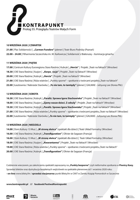 Prolog 55. Kontrapunktu odbędzie się między 10 a 13 września 2020 roku. Wiodącą sceną będą przestrzenie Centrum Kultury Euroregionu Stara Rzeźnia. Wydarzeń plenerowych będzie można szukać na placu Solidarności oraz przy Nabrzeżu Starówka na Łasztowni. A na scenie Domu Kultury 13 Muz zostanie zaprezentowane przedstawienie dla najmłodszych widzów.