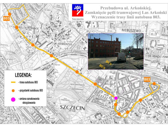 Linia 803 kursować będzie ulicami: Arkońska (powrót: Arkońska - Tatrzańska – Zdrojowa – Wojciechowskiego) – Niemierzyńska – Krasińskiego – al. Wyzwolenia – rondo Giedroycia – Kołłątaja – rondo Sybiraków – Asnyka – E. Orzeszkowej (powrót: Boguchwały).